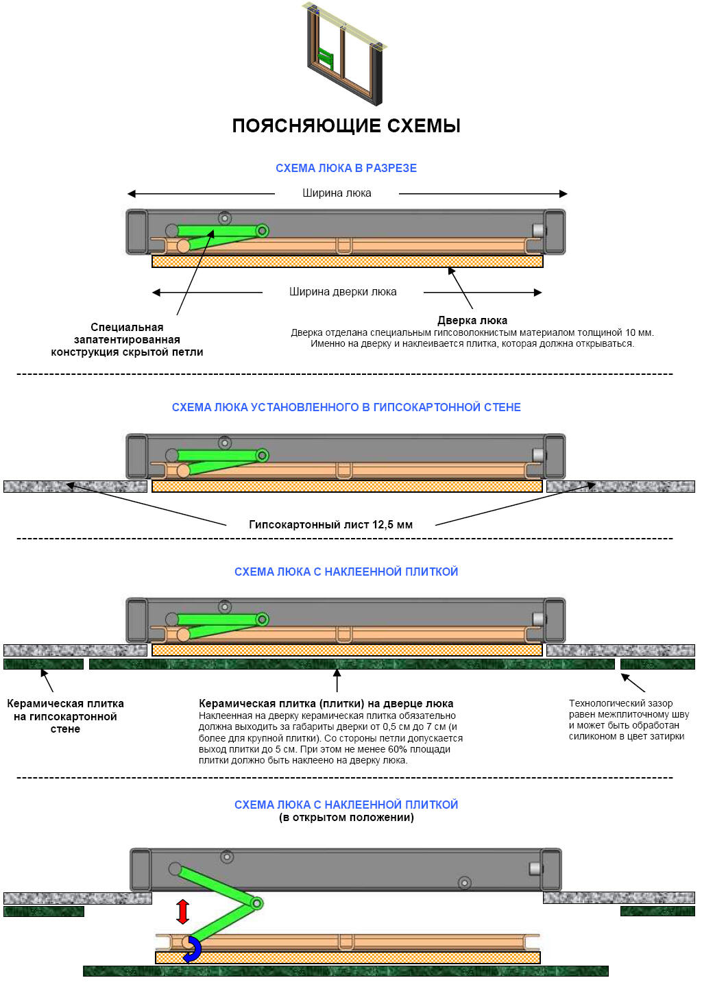Необходимо также продумать вопрос о достаточности ревизионного окна, так как возможно использование плитки одного размера на различных моделях люков. Следовательно, можно подобрать люки с большим или меньшим ревизионным проемом. Размер дверки люка и определяет размер ревизионного проема.