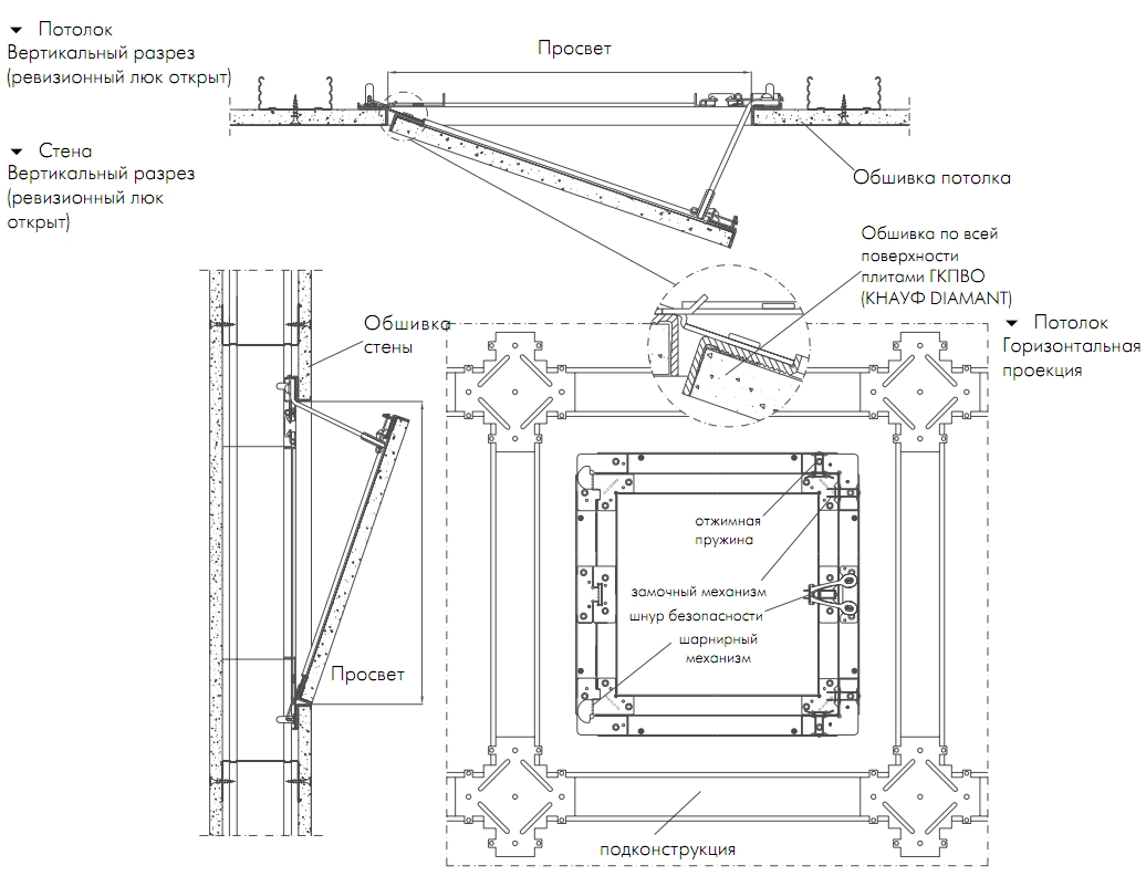Люк скрытого монтажа открывается путем нажатия на дверцу люка, при этом после разблокирования пружинного замка дверца удерживается предохранительными петлями. При необходимости дверцу люка можно вынуть полностью и обеспечить полный доступ к скрытому объекту.