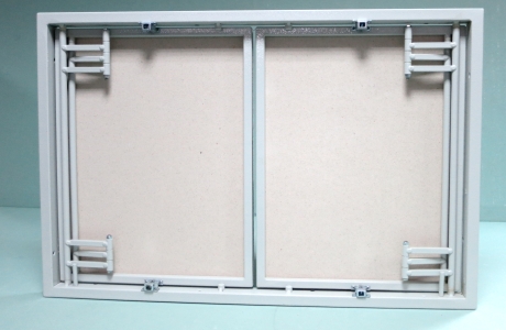Дводверні ревізійні люки під плитку - це різновид розпашних і натискних люків. Дводверні люки необхідно використати у разі, якщо ширина ревізійного отвору складає більше 700 мм Такі люки влаштовуються для обслуговування великогабаритної техніки - такий як кондиціонери, бойлеры, розподільники і тому подібне. При облицюванні поверхні гладкою, глянсовою або напівматовою плиткою Дводверні люки прихованого монтажу комплектуються роликово-клиновими замками. І тоді такі люки відкриваються за допомогою присосків, що входять в комплект постачання люка. Якщо ж облицювальна плитка має шорстку поверхню або рельєфний малюнок необхідно замовляти люк з натискним механізмом відкривання, які відкриваються шляхом легкого натиснення на дверці.