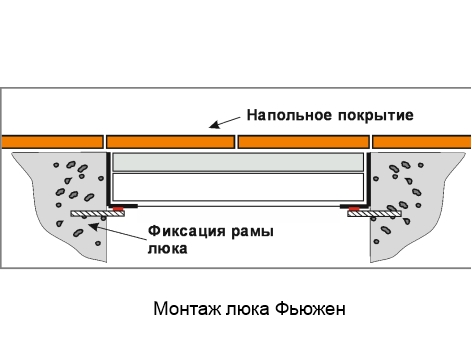 Зовнішня рама підлогового люка "Ф'южен", в яку вкладається кришка, виготовлена з сталевого куточка перетином 40х40 мм. Кришка люка являє собою стільниковий конструкцію зі сталевої труби 20х40 мм. Ця конструкція зверху і знизу закрита двома листами металу товщиною 1 мм, між якими прокладений шар утеплювача з базальтової вати. Верхня частина кришки люка, по периметру, обварена квадратною трубою 15х15 мм, а всередині до листа металу приварена армована сітка з дроту діаметром 3 мм. При монтажі люка верхня частина кришки заповнюється клейовими складами для плитки.
