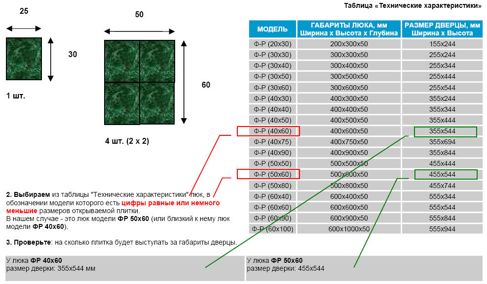 Необходимо также продумать вопрос о достаточности ревизионного окна, так как возможно использование плитки одного размера на различных моделях люков. Следовательно, можно подобрать люки с большим или меньшим ревизионным проемом. Размер дверки люка и определяет размер ревизионного проема.