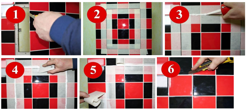 4. Наклейте плитку на дверку люка и стену. В это время дверка люка должна находиться в закрытом состоянии. Толщина плиточного клея, нанесенного на дверку, может быть в диапазоне 3-5 мм. Это позволит обеспечить работу нажимных замков для откидных люков, открывающихся нажатием. Следите, чтобы клей не попал на края плитки, выступающие за габариты дверки люка.